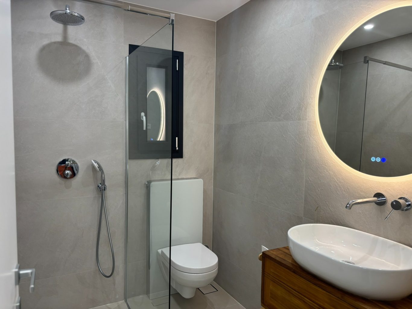 Das geschmackvolle Badezimmer mit Dusche verfügt über einen Spiegel mit Annehmlichkeiten wie Bloototh, um Ihre Musik unter der Brause zu genießen und Anti-Beschlag-Funktion. Ein Haartrockner ist ebenso vorhanden.